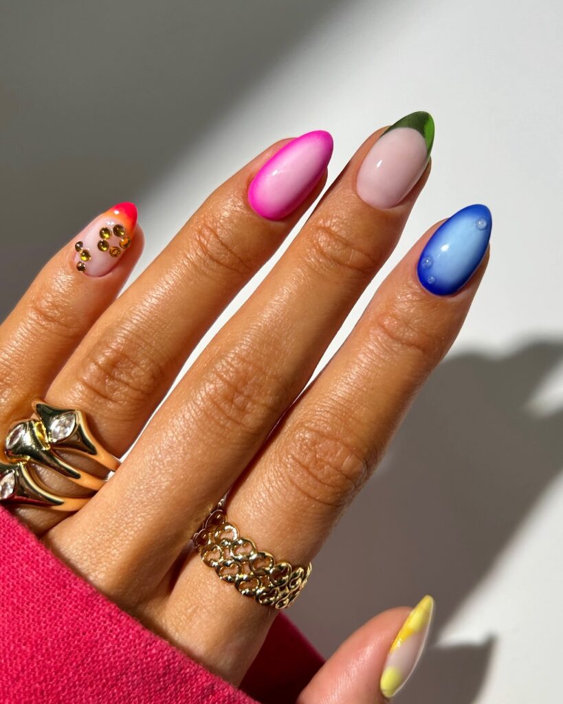 Nothing screams spring and summer like pastels. A mix of pastel green, pink, and lavender in alternating nails or combined in a swirl pattern delivers a youthful, cheerful vibe.